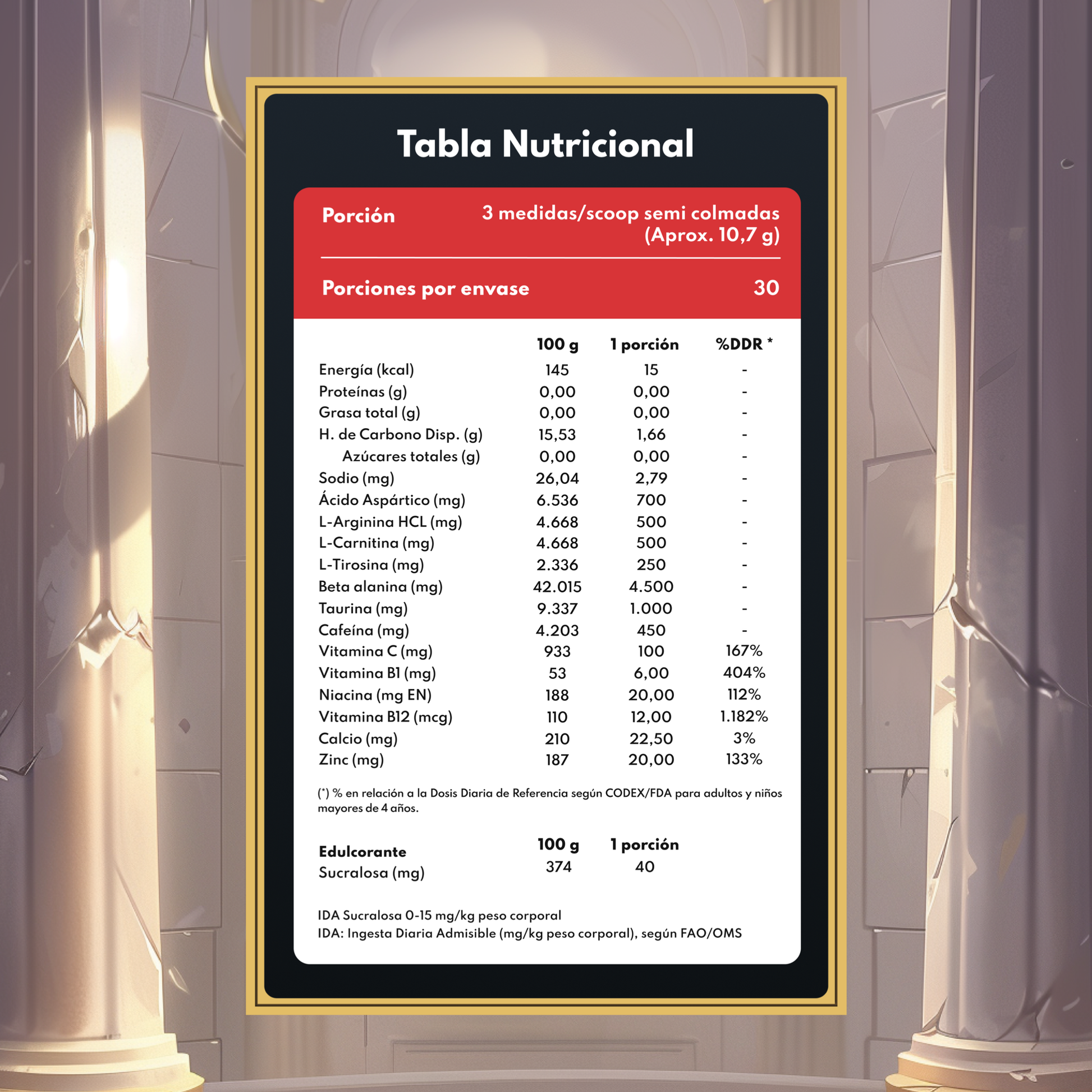 Cada vez que invocas la fuerza de ARES 🔥, tu cuerpo se llena de una energía explosiva que te permite dominar cada repetición, superar cada límite y retrasar la fatiga como un verdadero guerrero. Con ingredientes como cafeína, taurina y beta-alanina, este pre-entreno es tu aliado en la guerra contra la debilidad, asegurando que tu rendimiento sea digno de la batalla y que cada entrenamiento te acerque más a la victoria.